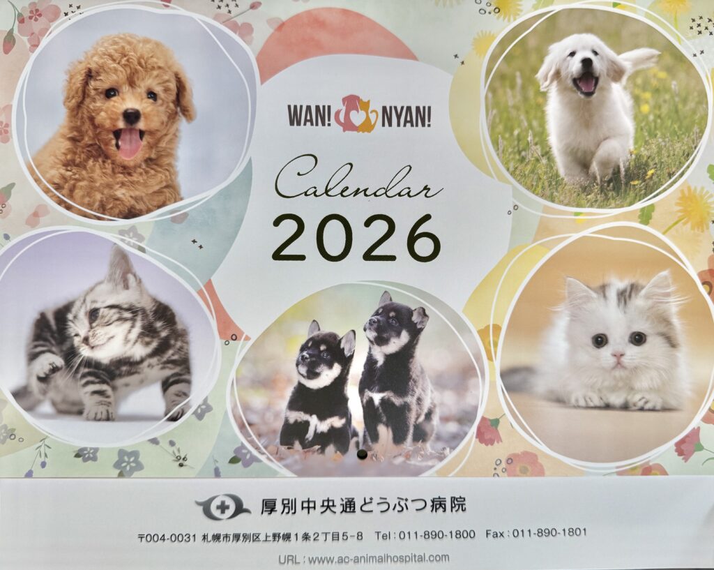 2026年 2025年11月4日 その他 毎年恒例のカレンダーを今年も配布させていただきます。数に限りがあるため、当院で各種予防をされている飼い主様(予防が免除されている場合は例外)に限らせていただいていますが、ご希望の方はスタッフまでお気軽にお問い合わせください。 ○配布期間:2025年11月〜2026年3月までで、無くなり次第終了となります。 ○配布対象:当院にて各種予防を全て行なっている方 今年も可愛い写真満載です♪数に限りがありますのでご希望の方お早目に!