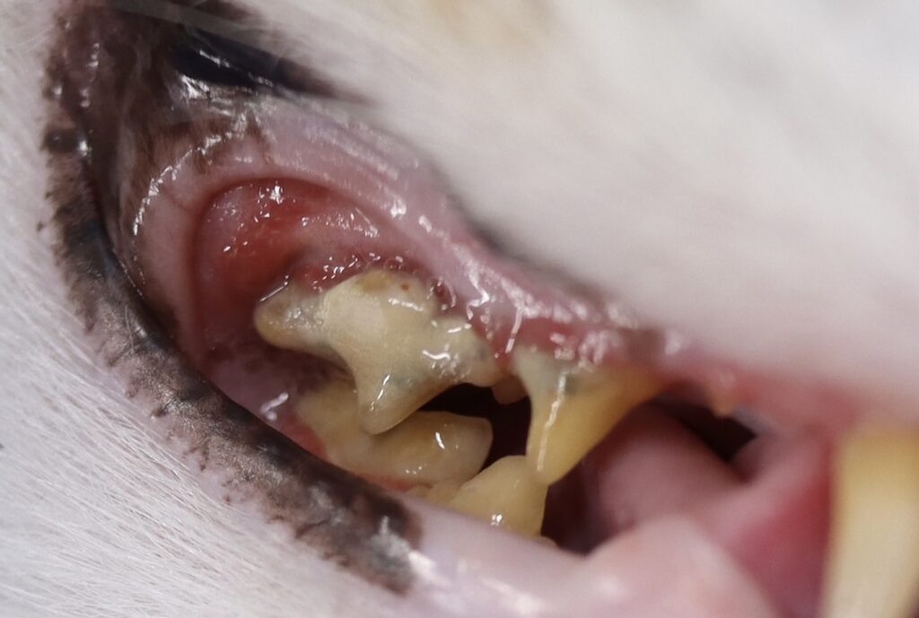 盛り上がってきた歯石(菌の塊)が歯肉にかぶさったり、頬粘膜と擦れることによって歯周囲の粘膜に炎症を起こしてしまいます。