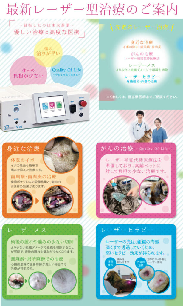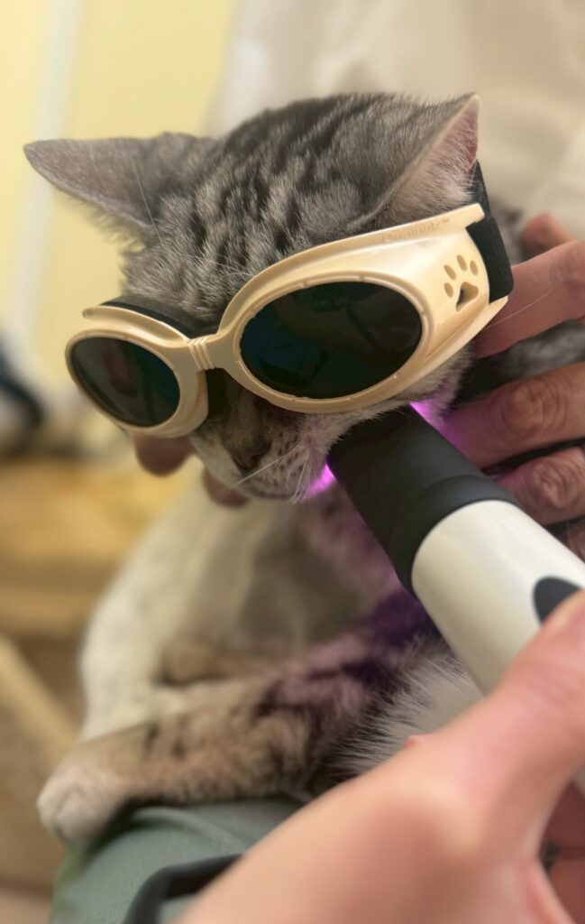 こうした高齢の猫ちゃん達に対して効果が期待できる治療法の一つに半導体レーザーによる消炎治療があります。ほんのり暖かい光を当てる治療で苦痛はありません。知らない人(動物病院スタッフ)が苦手な性格のコの場合、飼い主の方がご自身で照射してあげる事も可能です。